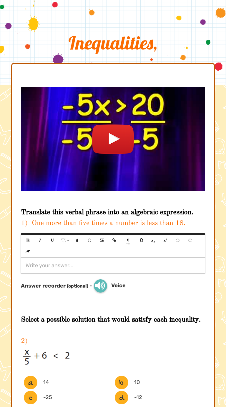 13 8TH GRADE MATH INEQUALITIES WORKSHEET from lh5.googleusercontent.com Are you looking for worksheets to help your students better understand the algebraic notions of inequalities? Alternatively, learners can attend extra maths lessons at our centre. Some of the worksheets displayed are two step inequalities date period, 11 12 inequality quiz, study guide practice unit 5 test inequalities, concept 12 solving linear inequalities, concept 11 writing graphing inequalities, one step inequalities date period, review inequalities date, identifying. Students have to read and decide who is healthier and then do a gap f. By the way, about writing inequalities worksheets, we've collected various similar pictures to inform you more. Includes language, informational and literature text, and writing. Plot an inequality, write an inequality from a graph, or solve with this worksheet generator, you can make customizable worksheets for linear inequalities in one variable. One step inequalities by multiplying.